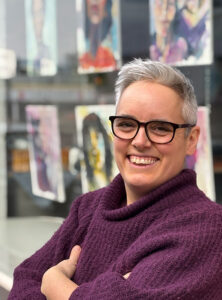 Seit 2025 hat dieser Auftrag ein Zuhause im Atelier Bildwechsel gefunden. Mit kräftigen Farben portraitiert Ka Schmitz Menschen  und Pflanzen und lotet dabei die Übergänge zwischen Realismus und Abstraktion aus. Der Moment, in dem ein Gesicht mit dem Hintergrund verschwimmt, wo ein Blütenblatt reine Farbe wird, fasziniert sie. Ihre jahrelange Arbeit als Illustratorin und Comiczeichnerin führt dabei immer wieder zu spannenden Allianzen von ausdrucksstarken Gesichtern und Emotionen mit kräftigen, rauen Pinselstrichen.